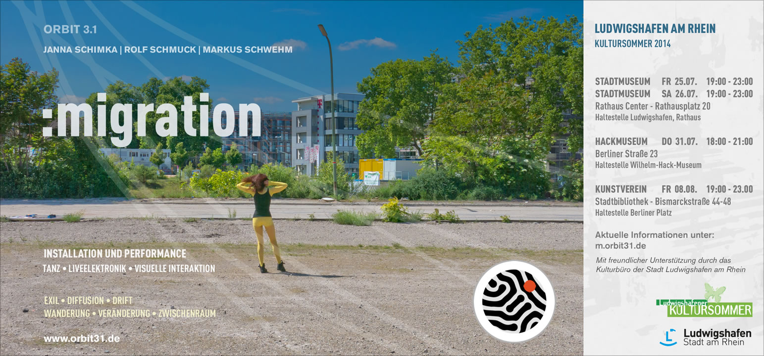Begehbare Installationen und Performances der Gruppe ORBIT 3.1 – Janna Schimka (Tänzerin, Musikerin), Rolf Schmuck (Musiker, Medienkünstler), Markus Schwehm (Mathematiker, Modellierer). Besucher können jederzeit kommen, gehen oder wiederkommen, beliebig lange verweilen. Die vier Veranstaltungen sind unterschiedlich, unabhängig voneinander und den jeweiligen Räumlichkeiten angepasst.